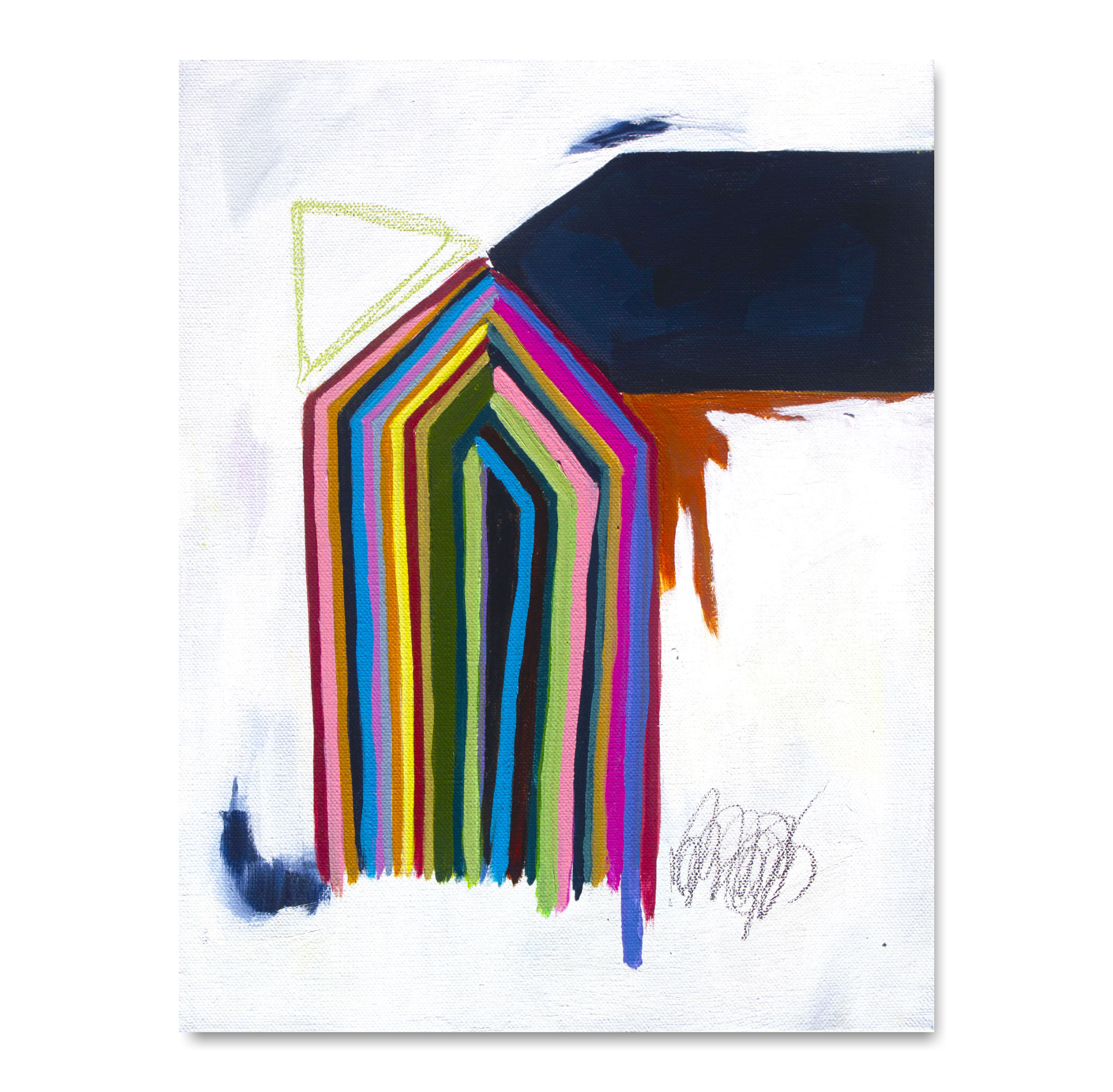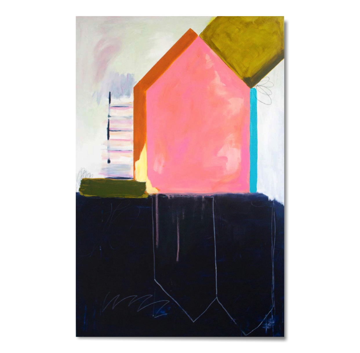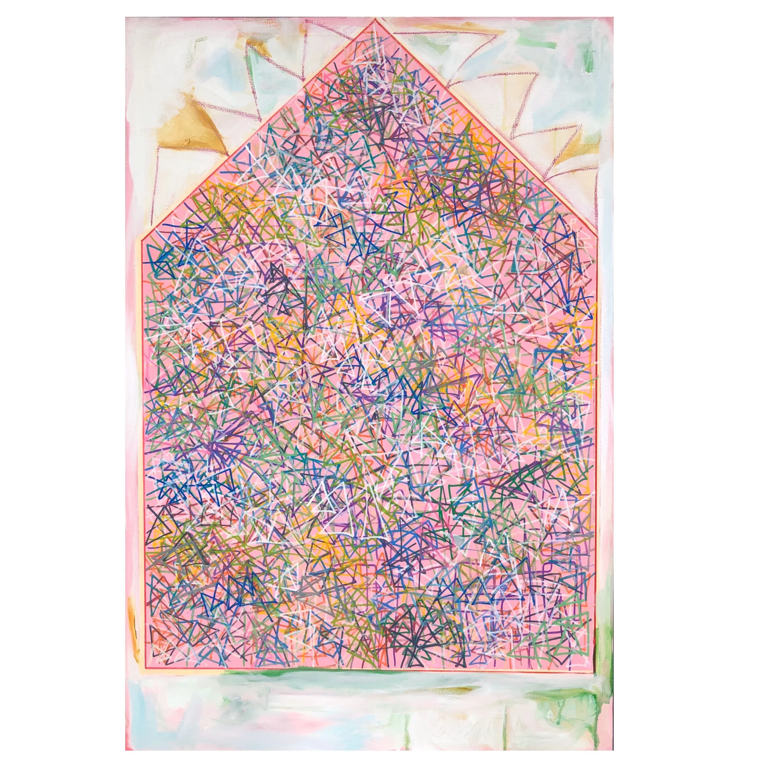 In this series of work I utilize the house form to represent a persona. My recent series of paintings explores the deconstruction the house form. Through gestural mark making, dynamic composition, and a vibrant palett, I intend to connect the viewer to the situations I am creating. I want to play with tension, ease, movement, and layered emotion. While the house can represent safety, solidarity and security this past year has complicated all of these identities. This work addresses the complex and dynamic feelings wrapped around the sense of home.