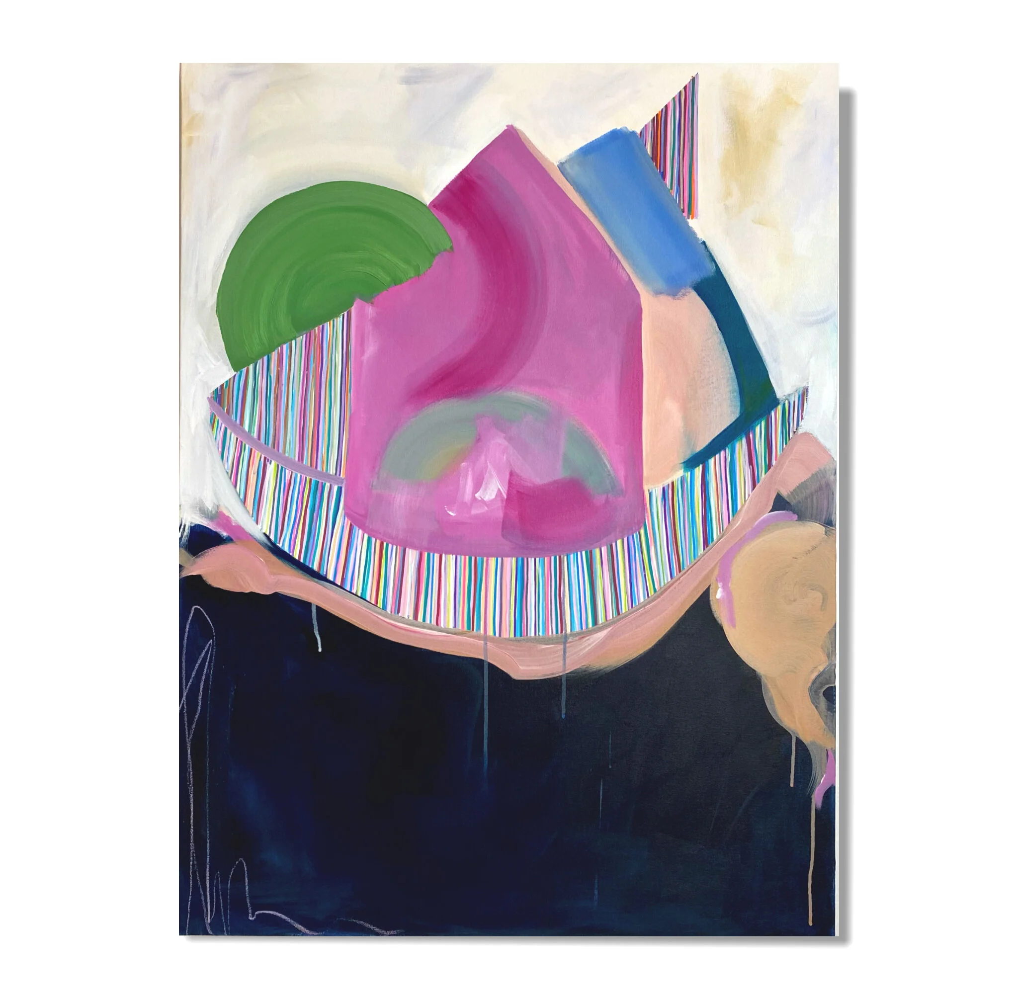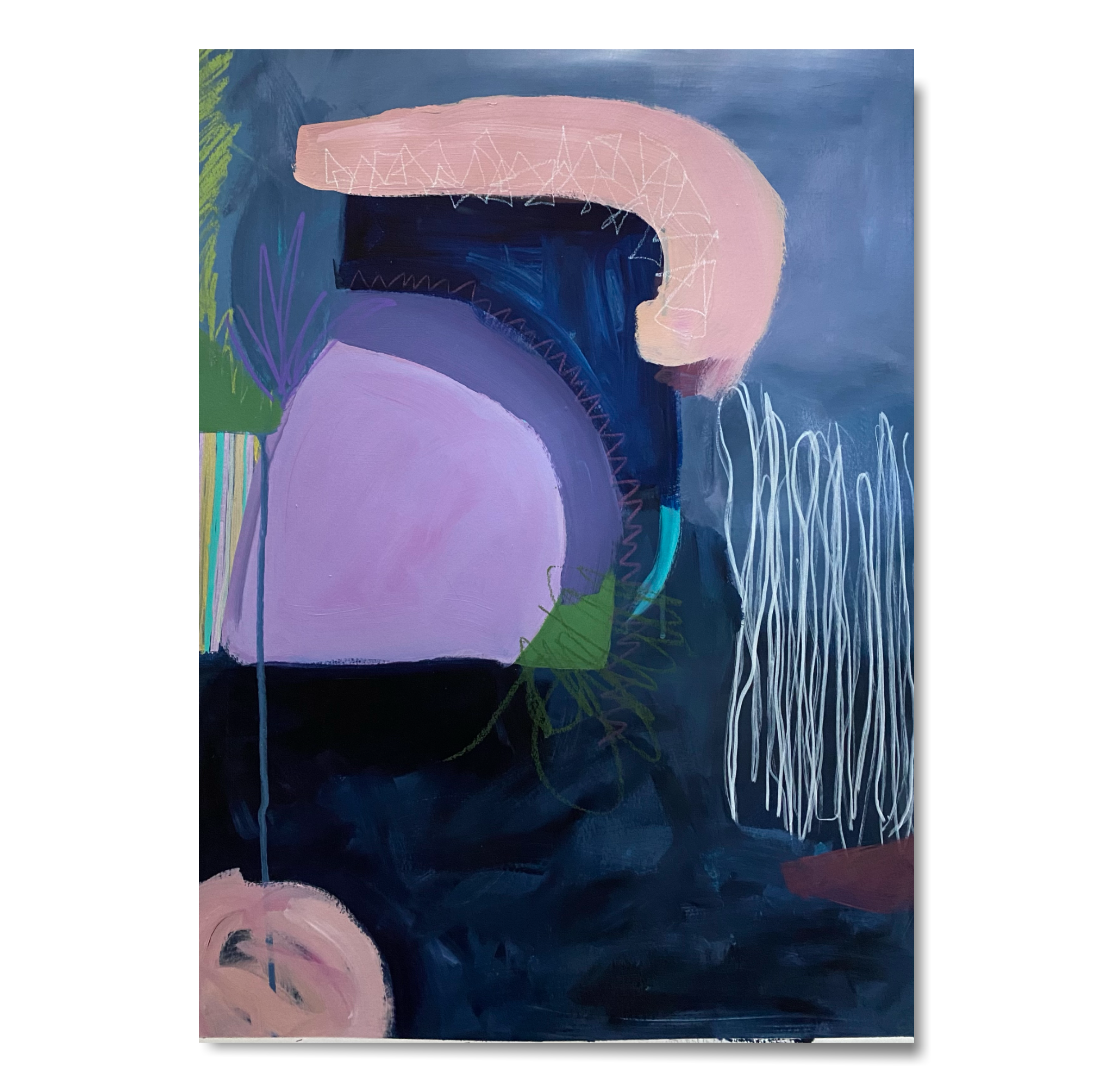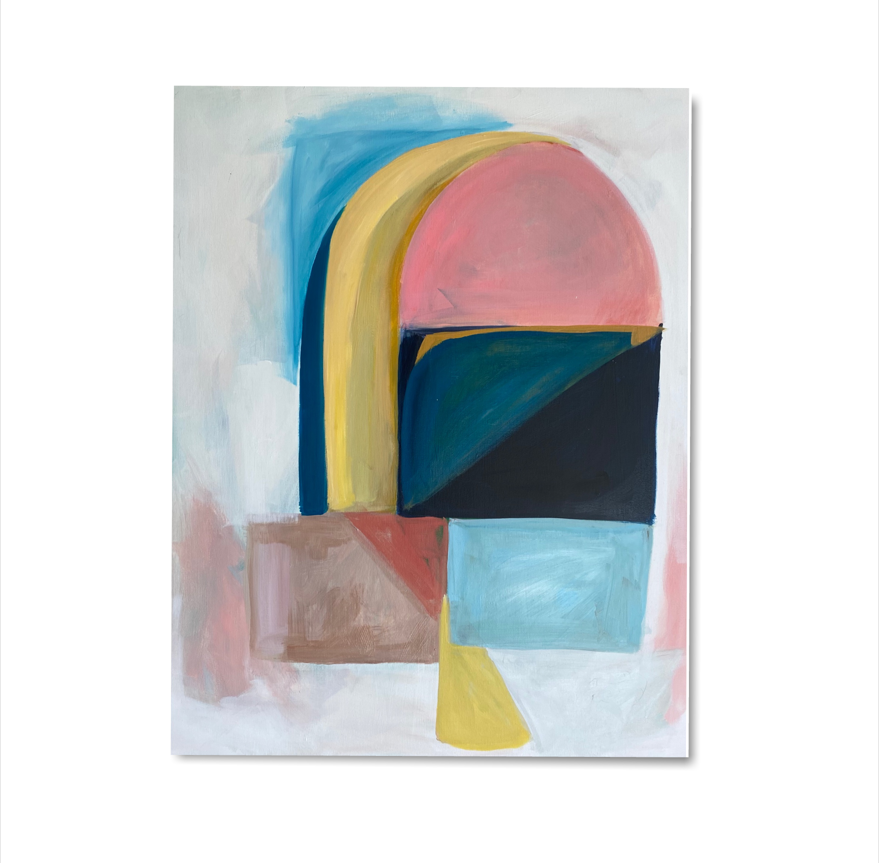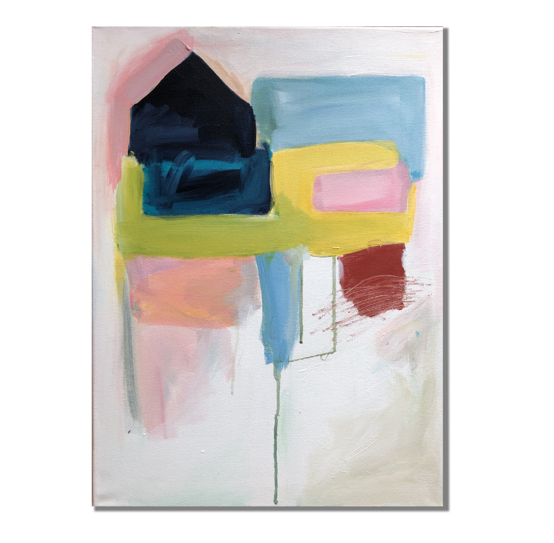 In this series of work I utilize the house form to represent a persona. My recent series of paintings explores the deconstruction the house form. Through gestural mark making, dynamic composition, and a vibrant palett, I intend to connect the viewer to the situations I am creating. I want to play with tension, ease, movement, and layered emotion. While the house can represent safety, solidarity and security this past year has complicated all of these identities. This work addresses the complex and dynamic feelings wrapped around the sense of home.
